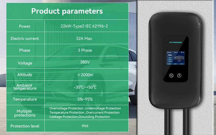 Wallbox 22 kW / 32 A – Tipo 2 | Wi-Fi & Cartão RFID - 10 METROS Cabo